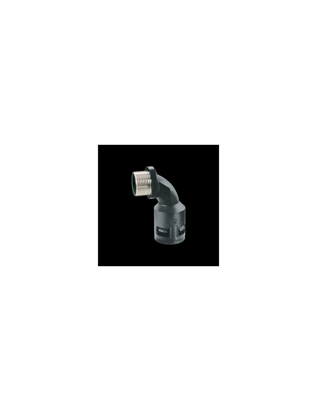 90° curved fittings with fixed metal male thread made of polyamide. The terminal part is made of a nickel-plated brass threaded insert. Suitable for applications in particular temperature and mechanical stress conditions. The thread is ISO metric in compliance with the CEI EN 60423 standards.